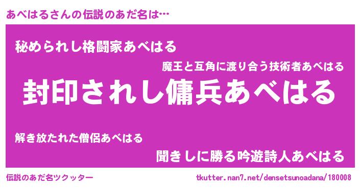 | 男性向けラノベタイトル風あだ名 | 『あべはるに滅ぼされるだけの簡単なお仕事です』 |