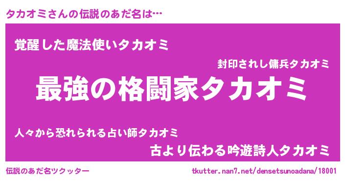 | 男性向けラノベタイトル風あだ名 | 『タカオミ~年齢イコール彼女いない歴の魔法使い~』 |