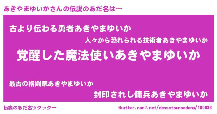 | 男性向けラノベタイトル風あだ名 | 『この素晴らしい世界にあきやまゆいかを!』 |
