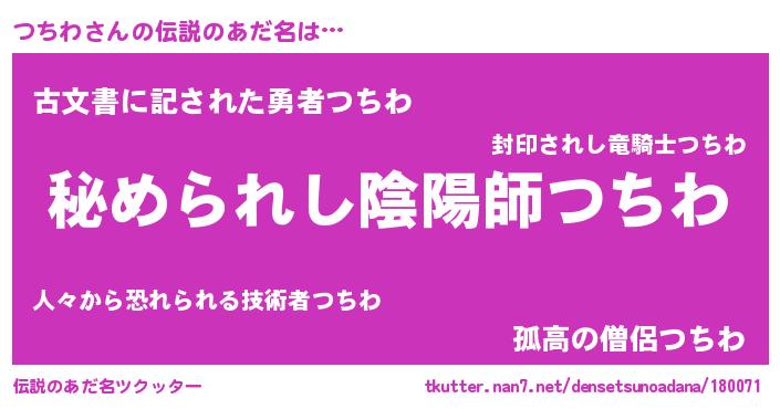 | 男性向けラノベタイトル風あだ名 | 『緋弾のツチワ』『はたらくつちわさま!』 |