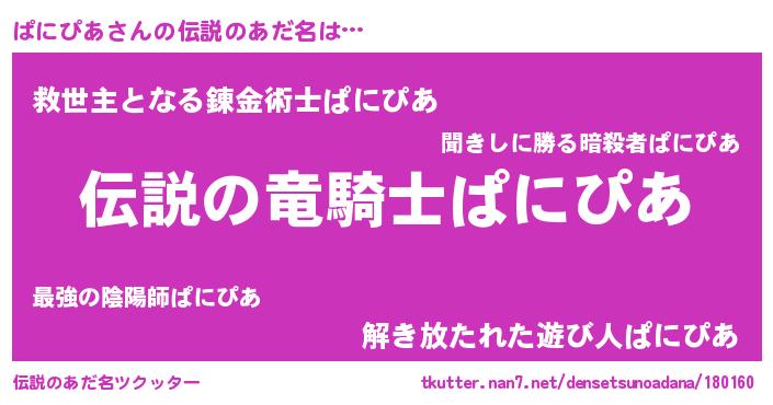 | 男性向けラノベタイトル風あだ名 | 『ぱにぴあの憂鬱』『パニピアスレイヤー』 |
