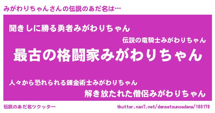 | ヒーロー風カッコイイあだ名 | 『仮面ミガダー』『ネオミガワリチャン』 |