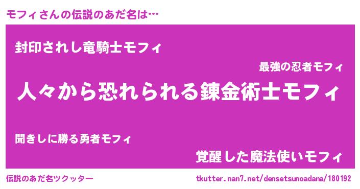 | 自動車の名前っぽいあだ名 | 『フェモーフ』『モンR』『モフティマ』 |