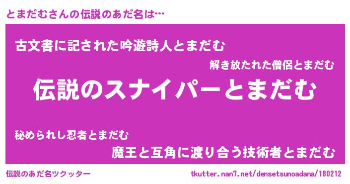| 男性向けラノベタイトル風あだ名 | 『とまだむの憂鬱』 |