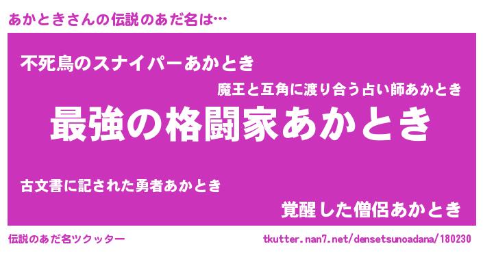 | 意味不明あだ名 | 『あかときフォーエバー』『自称あかとき』 |