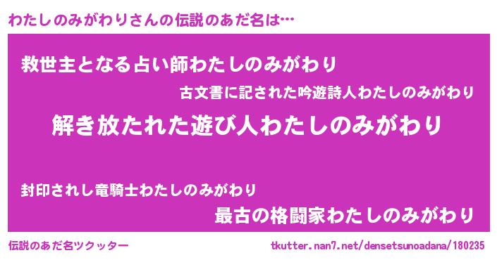 | ヒーロー風カッコイイあだ名 | 『銀牙騎士ワタ』『ネオワタシノミガワリ』 |