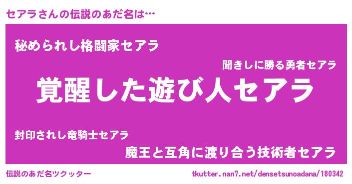 | ヒーロー風カッコイイあだ名 | 『天弓騎士セア』『ウルトラセアラマン』 |