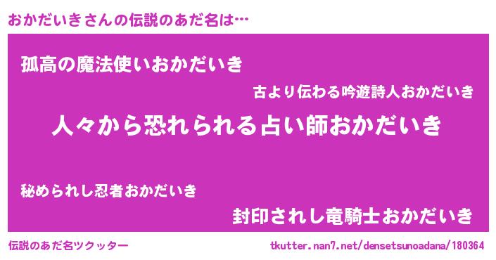 | 男性向けラノベタイトル風あだ名 | 『おまえをオタクにしてやるから、俺をおかだいきにしてくれ! 』 |