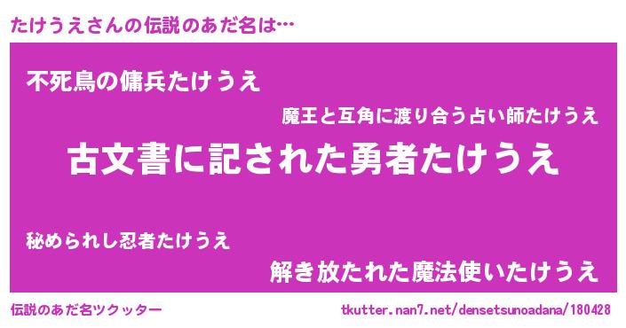 | ヒーロー風カッコイイあだ名 | 『ネオタケウエ』『超時空戦士タケウエ』 |