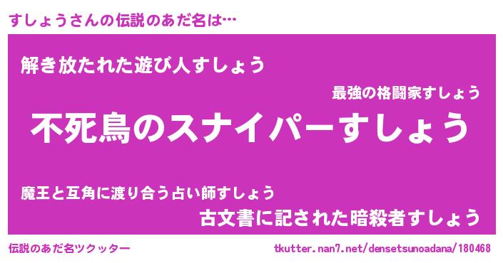 | 男性向けラノベタイトル風あだ名 | 『Re:すしょうから始める異世界生活』 |