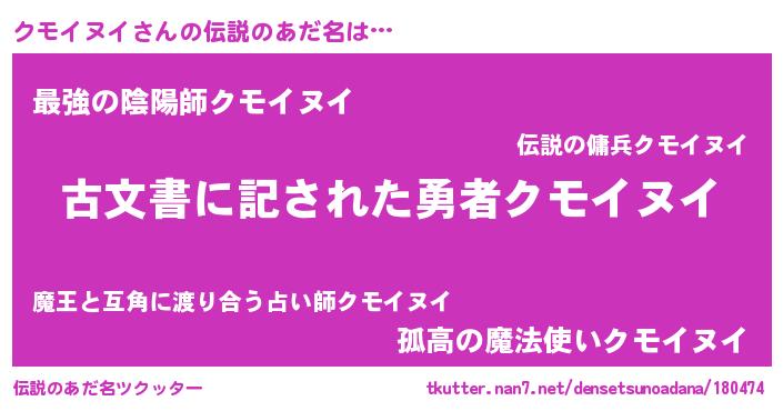 | 意味不明あだ名 | 『住所不定無職クモイヌイ(91歳)』 |