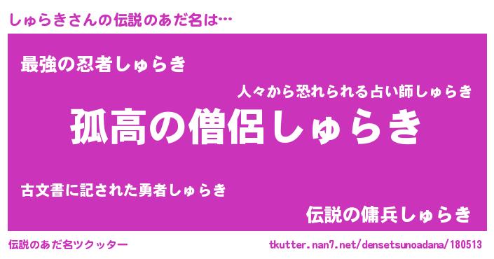 | ヒーロー風カッコイイあだ名 | 『暗黒騎士シュ』『ウルトラしゅらきマン』 |