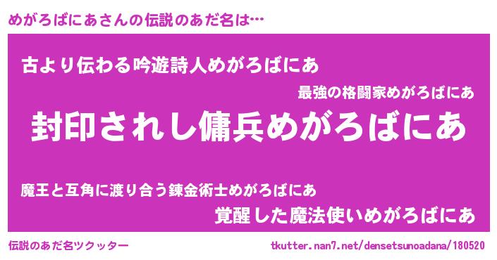 | ヘコむあだ名 | 『めがにゅー』『めがろばにあ(震え声)』 |