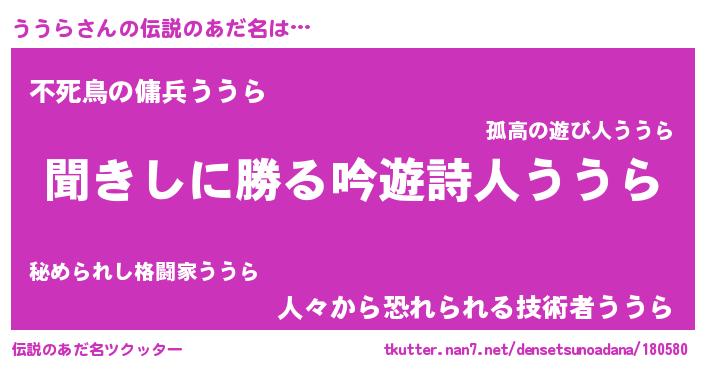 | 男性向けラノベタイトル風あだ名 | 『ううらという概念が存在しない退屈な世界 』 |