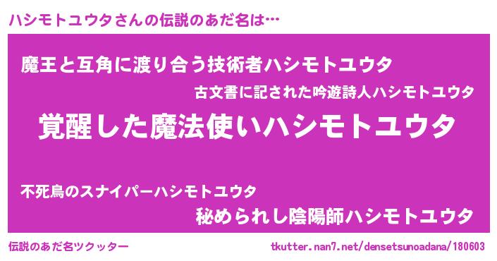 | 男性向けラノベタイトル風あだ名 | 『ハシモトユウタの嫁は女の子じゃないと思った?』 |