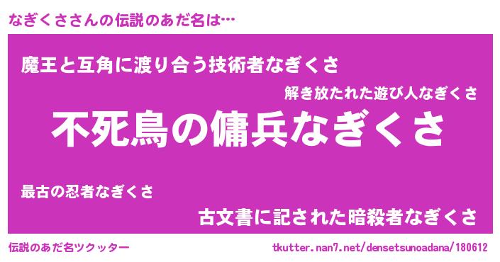 | 女子向けラノベタイトル風あだ名 | 『なぎくさ姫と円卓の騎士』 |