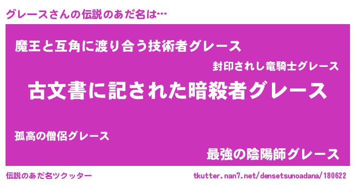 | 男性向けラノベタイトル風あだ名 | 『グレースに滅ぼされるだけの簡単なお仕事です』 |