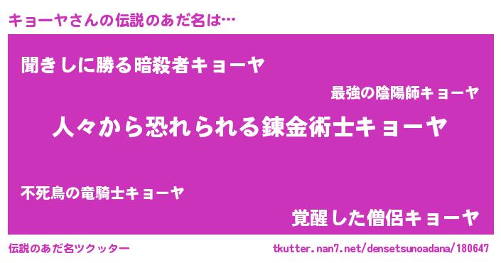 | ヒーロー風カッコイイあだ名 | 『正義の使者キョーヤ』『ネオキョーヤ』 |