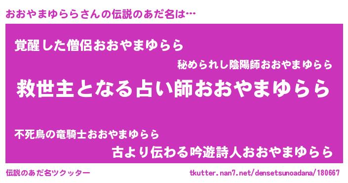 | 男性向けラノベタイトル風あだ名 | 『おおやまゆらら~年齢イコール彼女いない歴の魔法使い~』 |