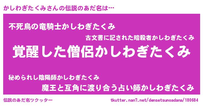 | 男性向けラノベタイトル風あだ名 | 『かしわぎたくみの嫁は女の子じゃないと思った?』 |