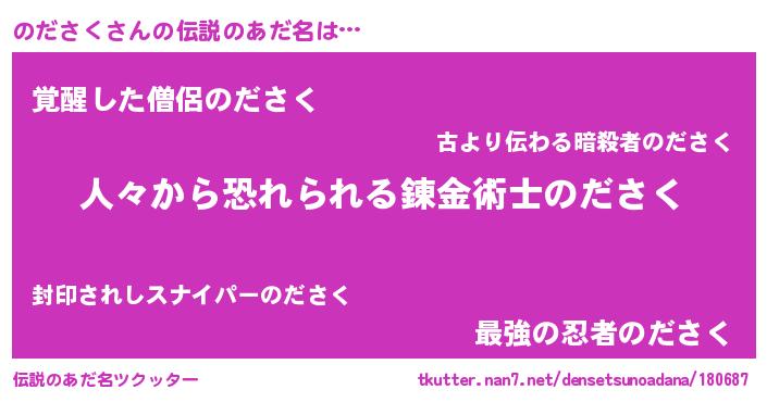 | 男性向けラノベタイトル風あだ名 | 『魔弾の王とのださく』 |