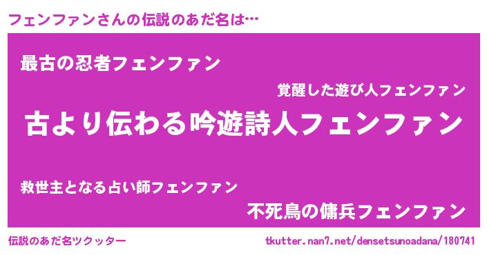 | 男性向けラノベタイトル風あだ名 | 『フェンファンという概念が存在しない退屈な世界 』 |