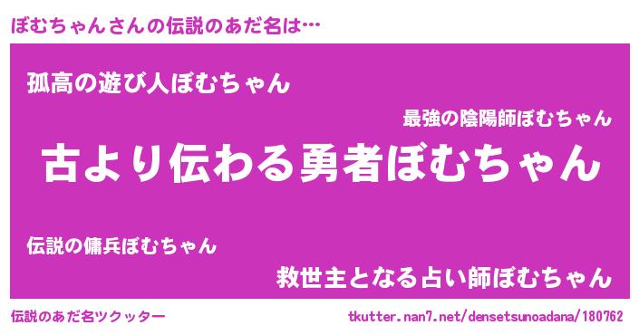 | 男性向けラノベタイトル風あだ名 | 『ぼむちゃんという概念が存在しない退屈な世界 』 |
