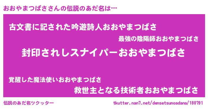 | 男性向けラノベタイトル風あだ名 | 『オオヤマツバサアートオンライン』 |