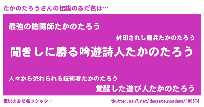 | 女子向けラノベタイトル風あだ名 | 『たかのたろうなんてお断りですっ。』 |