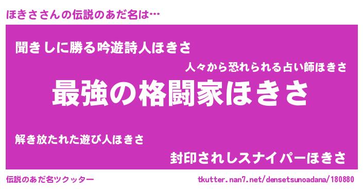 | 男性向けラノベタイトル風あだ名 | 『うちの娘の為ならば、俺はもしかしたらほきさも倒せるかもしれない。』 |