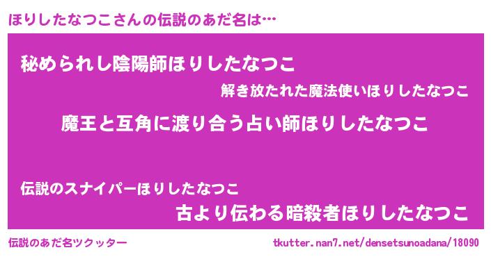 | 女子向けラノベタイトル風あだ名 | 『乙女ゲームの破滅フラグしかない悪役ほりしたなつこに転生してしまった…』 |