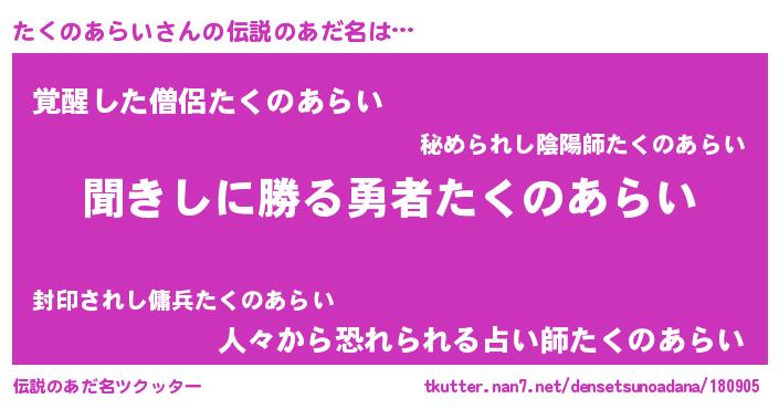 | 意味不明あだ名 | 『自称たくのあらい』 |