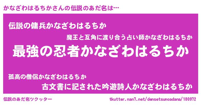 | 男性向けラノベタイトル風あだ名 | 『うちのかなざわはるちかが世界を掌握している!』 |