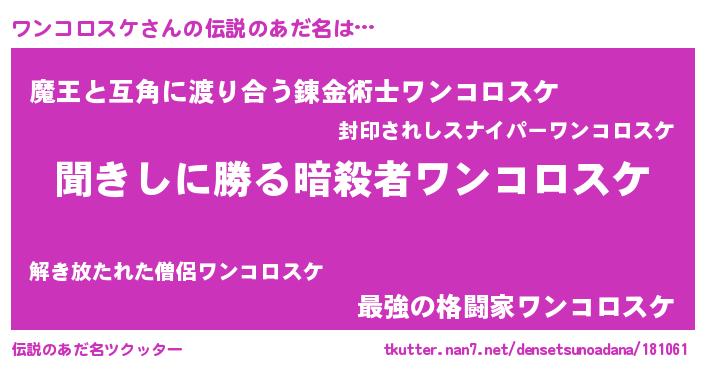 | 男性向けラノベタイトル風あだ名 | 『ワンコロスケスレイヤー』 |