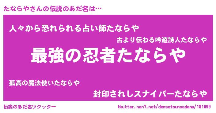 | 意味不明あだ名 | 『たならやフォーエバー』『自称たならや』 |