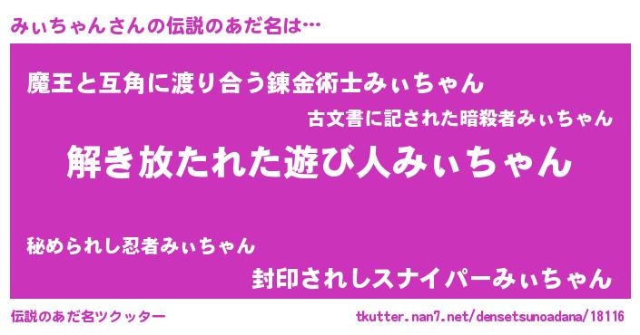 | ヒーロー風カッコイイあだ名 | 『魔戒騎士ミィ』『仮面ミィダー』 |