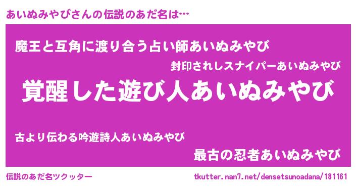 | 意味不明あだ名 | 『とにかく怪しいあいぬみやび』 |