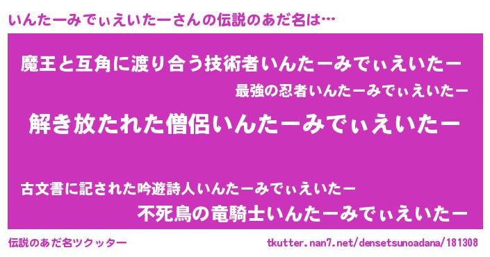 | 男性向けラノベタイトル風あだ名 | 『いんたーみでぃえいたーの嫁は女の子じゃないと思った?』 |