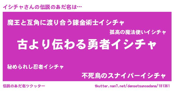 | 男性向けラノベタイトル風あだ名 | 『転生したらイシチャだった件』 |
