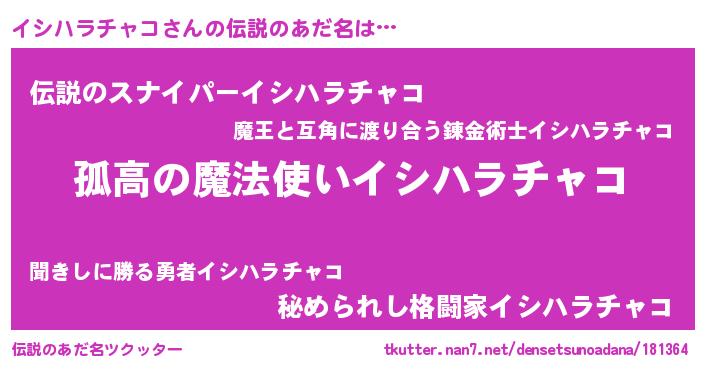 | 男性向けラノベタイトル風あだ名 | 『緋弾のイシハラチャコ』 |