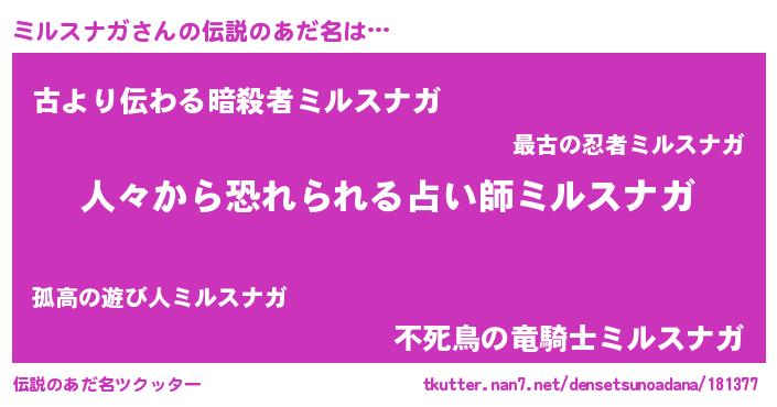 | 意味不明あだ名 | 『住所不定無職ミルスナガ(41歳)』 |