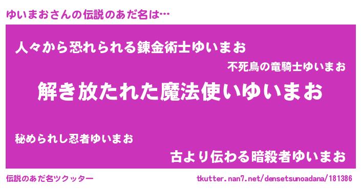 | 女子向けラノベタイトル風あだ名 | 『闇のゆいまお』『ゆいまおの契約王妃』 |