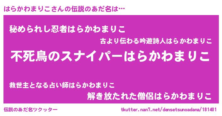 | 男性向けラノベタイトル風あだ名 | 『転生したらはらかわまりこだった件』 |