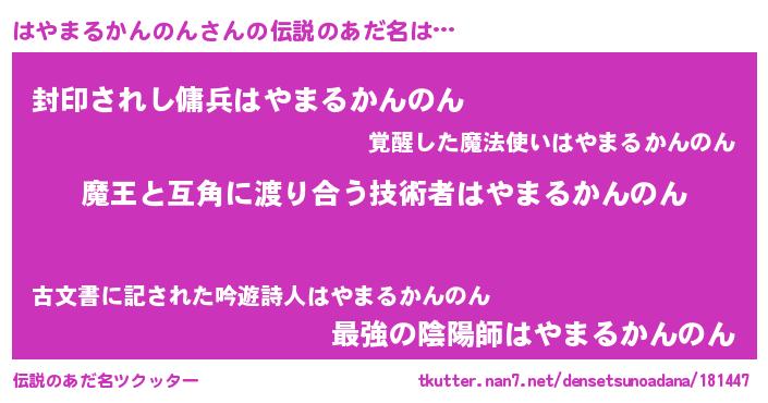 | 意味不明あだ名 | 『住所不定無職はやまるかんのん(13歳)』 |