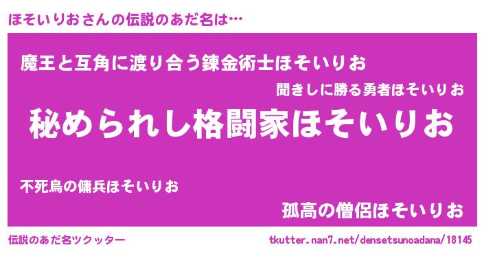 | 男性向けラノベタイトル風あだ名 | 『やはりほそいりおの青春ラブコメはまちがっている 』 |