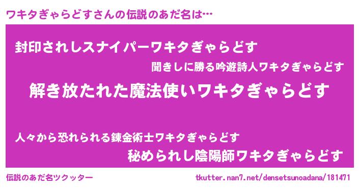 | 男性向けラノベタイトル風あだ名 | 『ワキタぎゃらどすの嫁は女の子じゃないと思った?』 |