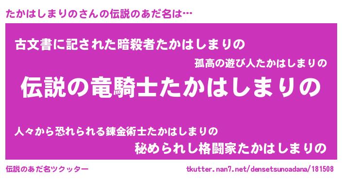 | ヒーロー風カッコイイあだ名 | 『仮面タカダー』『ネオタカハシマリノ』 |