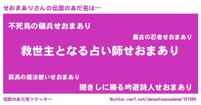 | 男性向けラノベタイトル風あだ名 | 『Re:せおまありから始める異世界生活』 |
