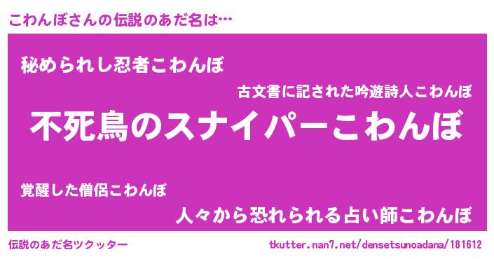 | 男性向けラノベタイトル風あだ名 | 『Re:こわんぼから始める異世界生活』 |