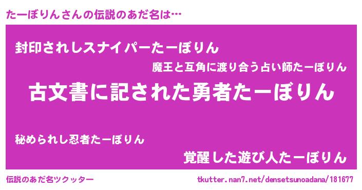 | 肩書あだ名 | 『たーぼりん総統』『たーぼりん大将』 |